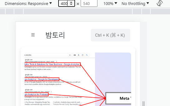 아래의 이미지처럼 width가 400일경우 웹페이지가 어떻게 보이는지 확인할 수 있습니다.