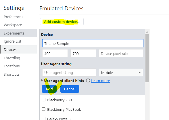 Add custom device...를 누르고, Device 명칭을 입력 후 원하는 해상도를 입력하여 간편하게 확인할 수 있습니다.