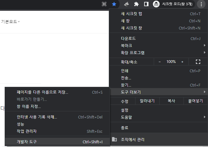 개발자도구 (브라우저 + F12 혹은 아래 이미지 참고)를 엽니다.