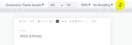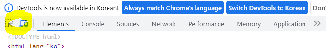 개발자 도구를 확인할 수 있는데, 아래 이미지중 노란색으로 동그랗게 칠한 아이콘을 누릅니다.