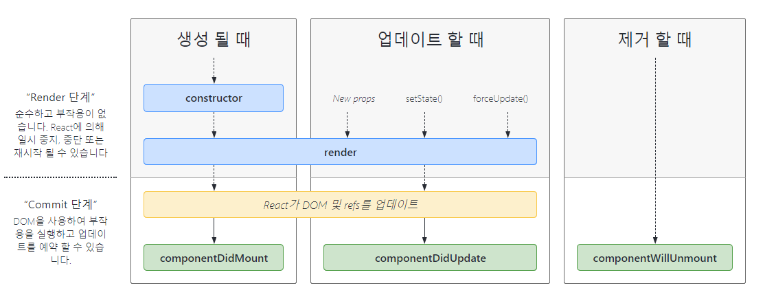 해당 글은 React의 '클래스형 컴포넌트'의 '생명주기(lifecycle)'를 이해하기 위한 글입니다. 1) React의 생명주기 용어 용어 설명 ~ will 어떤 작업을 수행하기 전에 실행되는 메서드와 관련된 용어입니