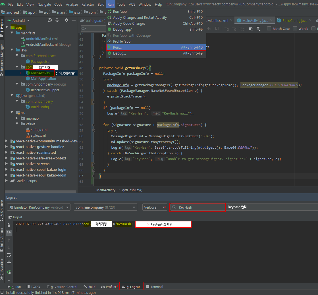 3~4) 최하단 Logcat을 누르고 'KeyHash'를 검색한다.